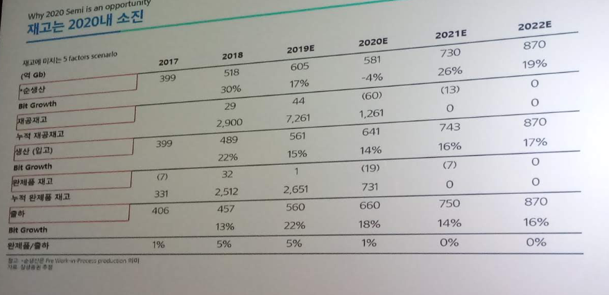 내년 중반까지는 거의 투자가 거의 이루어지고 있지 않다. 그래서 생산은 점점 줄어들고 있다는 의미 어떤 분과 이런 얘기를 함. 요즘 반도체 공장은 라인 정리를 하느라 바쁘다. 예전에는 가동률을 올리는 작업을 많이 했는데, 요즘은 효용성을 높이는 작업을 많이 한다. 샌드백을 없애는데 이러면 생산이 떨어진다. 그래서 내년에는 재고소진이 빨리 이루어질 것이라 기대. 이런 것이 주가에 상당한 모멘텀이 될 수 있다고 기대 가능