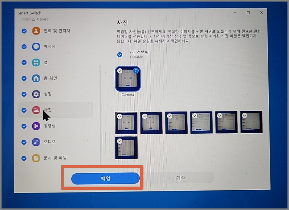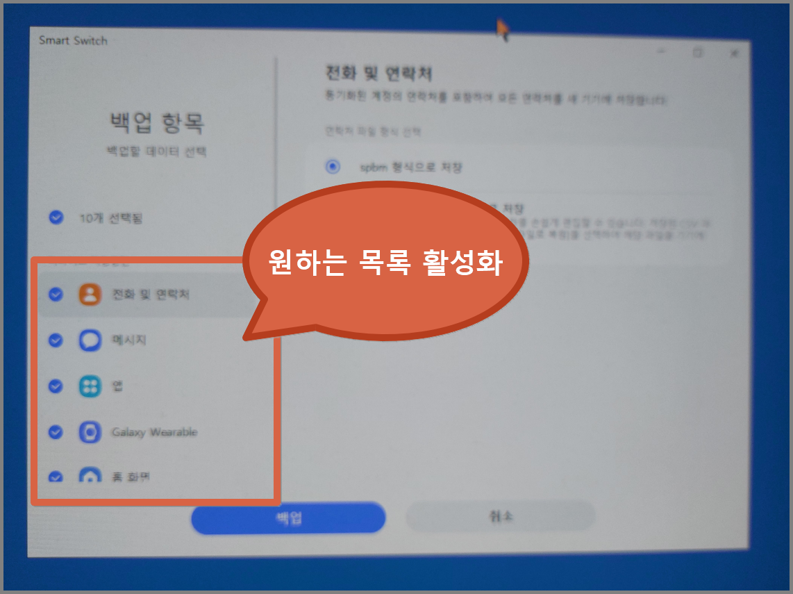 그럼 백업할 데이터를 선택할 수 있습니다.