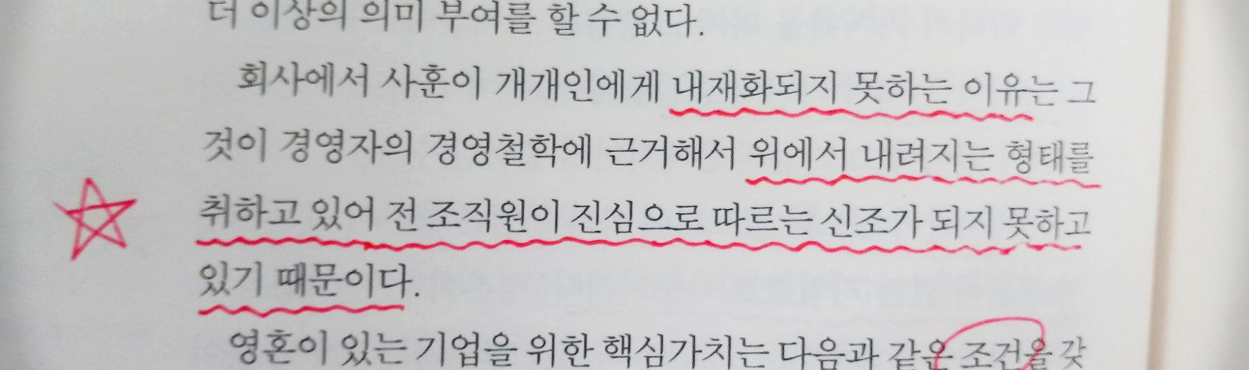 그리고 핵심가치가 가장 잘 내면화되어 있는 상태는 CEO가 직원들에게 그것을 누가 강조하지 않아도 직원들 스스로가 회사의 핵심가치를 당연한 것으로 받아들이는 수준이다.
