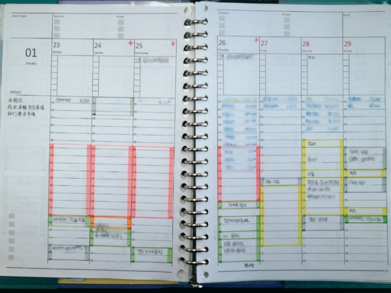 이렇게 작성해보니 제가 일주일을 어떻게 보냈는지 한눈에 보이더군요. 뭔가 시간을 알차게 보냈다고 생각되는 부분도 있고, 좀 게으르게 보낸 부분도 보이더군요. 동시에 어떻게 보완해야 할지도 알 수 있었습니다. 작성할 때는 귀찮았지만 막상 작성하고 나니, 왜 바인더를 쓰는지 알 것 같더군요.