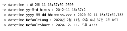 출력하는 포멧에 맞추어 날짜가 변경되는 것을 볼 수 있습니다. 그냥 now만 출력하면 이상한 순서로 나오는 반면 포멧을 지정하면 알아보기 쉽게 변경되는 것을 볼 수 있습니다. 포맷 양식도 단순한 편인데, yyyy-mm-dd 라고 하면 일반적으로 자주 쓰는 양식으로 나옵니다. 다른 포멧에 대한 정보는 아래 링크에서 확인할 수 있습니다.