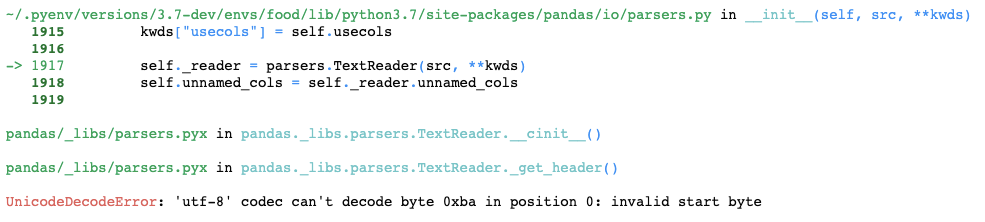 recipe.head()인코딩 형식을 알았다고 해서 바로 해결되는 것 아닙니다. 인코딩을 지정해줘도 아래와 같은 오류가 발생합니다.