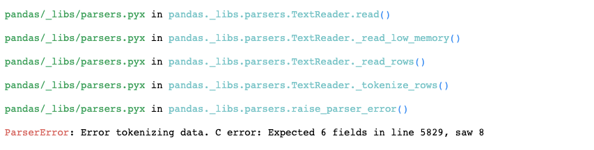 - 오류 메세지 :  Error tokenizing data. C error: Expected 6 fields in line 5829, saw 8