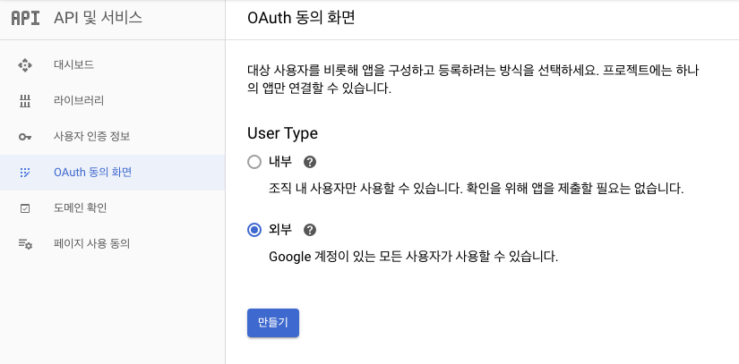 OAuth 동의 화면에서 외부를 선택하고 '만들기'를 클릭합니다. 그리고 애플리케이션 이름을 입력하고 하단의 저장 버튼을 클릭합니다.