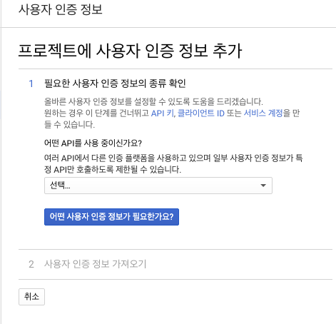 메인화면 우측 상단에 '사용자 인증 정보 만들기' 버튼이 있습니다. 해당 버튼을 클릭합니다. 혹은 좌측 메뉴 중 '사용자 인증 정보'를 클릭해도 됩니다. 아래 내용을 대로 설정한 후 '어떤 사용자 인증 정보가 필요한가요?'버튼을 클릭합니다.