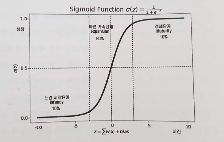 AI를 공부하면 초반에 배우는 것중 하나가 시그모이드 함수입니다. 다양한 데이터 범위를 0과 1 사이로 축약시키는 기능입니다. 저자는 기술성장도 이처럼 처음에는 엄청 안 오르지만 성장할 때 팍! 하고 오르고 어느 정도 정상에 도달하면 또 엄청 안 오른다는 것입니다. 공부도 마찬가지죠. 50점에서 80점까지는 쉽지만 그 이상은 엄청 안 오릅니다.