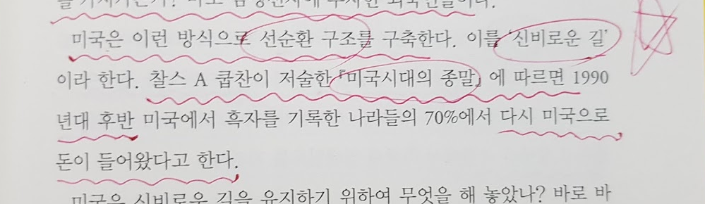 경제대국은 미국입니다. 미국은 심지어 달러를 막 찍어내도 인플레이션이 일어나지 않습니다. 세계 모든 나라가 달러를 사주기 때문에 미국의 물가는 오르지 않다는 거죠. 참으로 부러운 내용입니다. 이를 '신비로운 길'이라고 합니다. 저자가 미중 무역전쟁에서 미국의 승리를 얘기하는 이유도 바로 여기에 있습니다.