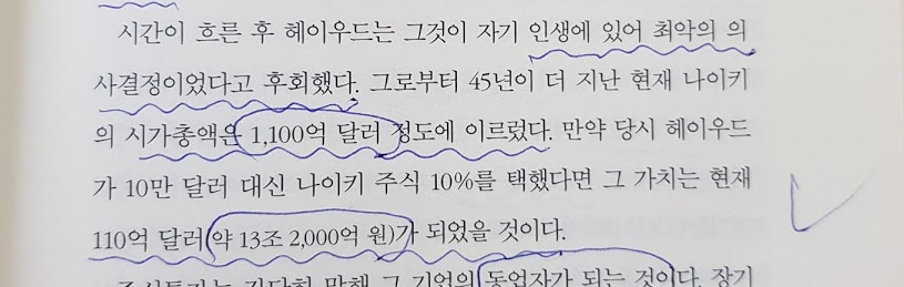스펜서라는 과거 유명한 운동선수가 있었습니다. 그때 나이키에서 광고협찬을 요청하죠. 내용은 10만달러와 지분 10% 중 양자택일이었습니다. 당시 중소기업이었던 나이키라 스펜서는 10만 달러를 선택했고 이는 인생 최대의 후회가 되었다고 합니다. 좋은 회사를 알아보는 눈이 필요한 이유입니다.