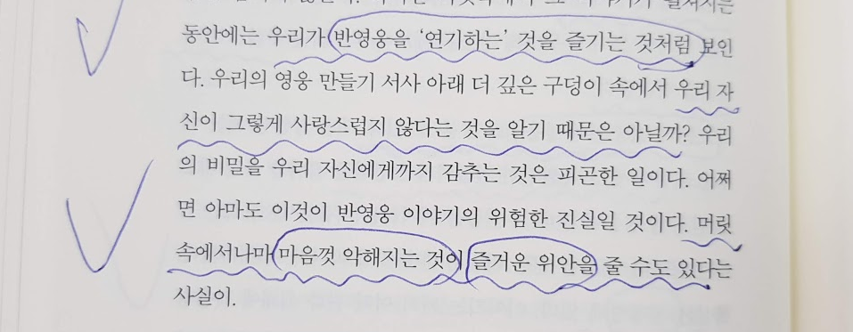 이야기에는 착한 영웅만 나오는 게 아닙니다. 영웅이 흑화 하는 경우도 있죠. 어떤 경우는 이런 스토리가 더 매력적일 때도 있습니다. 사람은 겉과 속이 다르다고 하는데 나의 숨겨진 감성을 대변해주고 공감할 수 있기 때문이라고 설명합니다. 책을 통해 선과 악을 다양하게 경험할수록 도덕관이 탄탄해지는 것 같습니다.