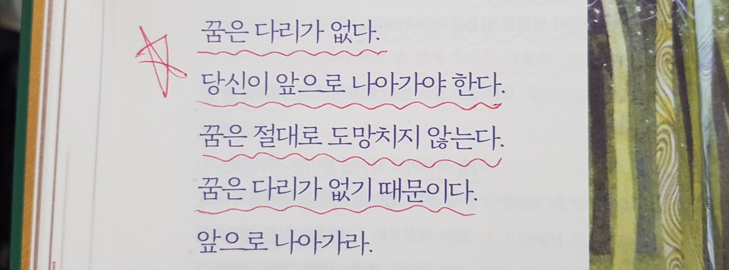 책에서 멋진 말을 보았습니다. 마치 노래 같아서 머릿속에 담아놓기 좋은 말입니다. 인생의 강물은 물살이 거세기 때문에 쉽게 건너가기 어렵습니다. 하지만 그 강을 스스로 건너가야 꿈을 잡을 수 있습니다. 다행히도 꿈은 다리가 없어 어디 도망가지 않는다고 합니다.