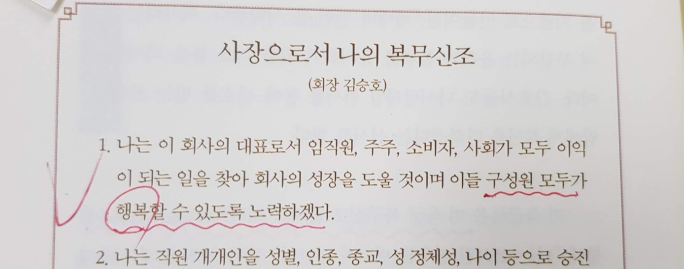 교실에 급훈이 있고, 마음속에는 좌우명이 있고, 회사에 비전이 있듯이 군대에는 복무 신조가 있습니다. 스노우폭스 김승호 회장님의 복무신조가 소개되어 있는데, 가장 처음이 '행복'입니다. 행복이 1순위인 회사라면 누구라도 가고 싶어 할 만큼 매력적일 것입니다.