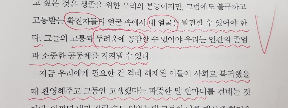 코로나는 사람을 차별하지 않습니다. 어느 날 갑자기 나도 모르게 걸릴 수도 있습니다. 그런데 코로나에 걸렸다고 하면 사회적인 비난이 쏟아지죠. 그들한테는 비난보다는 위로의 한마디가 가장 필요할 것입니다. 그래야 아이들이 그걸 보고 자라서 이 사회는 불신보다 배려가 있다고 말할 테니까요.