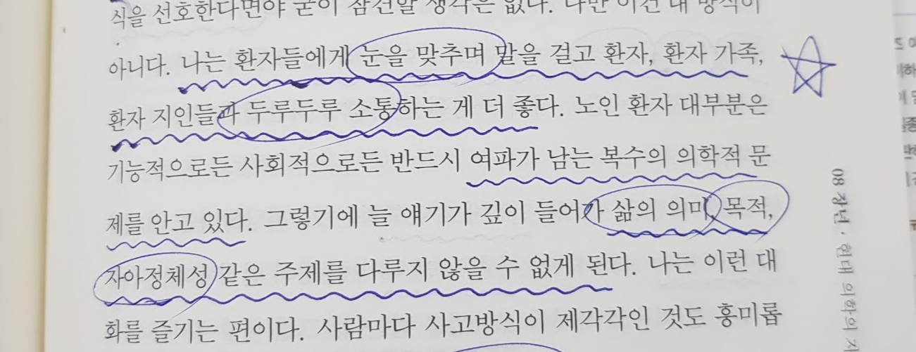 삶의 목적을 고민하는 것은 언제나 고결합니다. 설령 그것이 죽음을 맞이하는 응급실 침대 위라고 해도 마찬가지입니다. 하지만 현대의 의료 시스템은 이런 인간성을 결여되어 있습니다. 머리가 아프다고 두통약만 처방한다고 끝이 아닙니다. 눈높이를 맞추고, 소통을 통해 삶의 의미와 목적, 자아정체성을 존중하고 공감하는 것이야 말로 지금의 노인들한테 가장 필요한 것이라고 합니다.