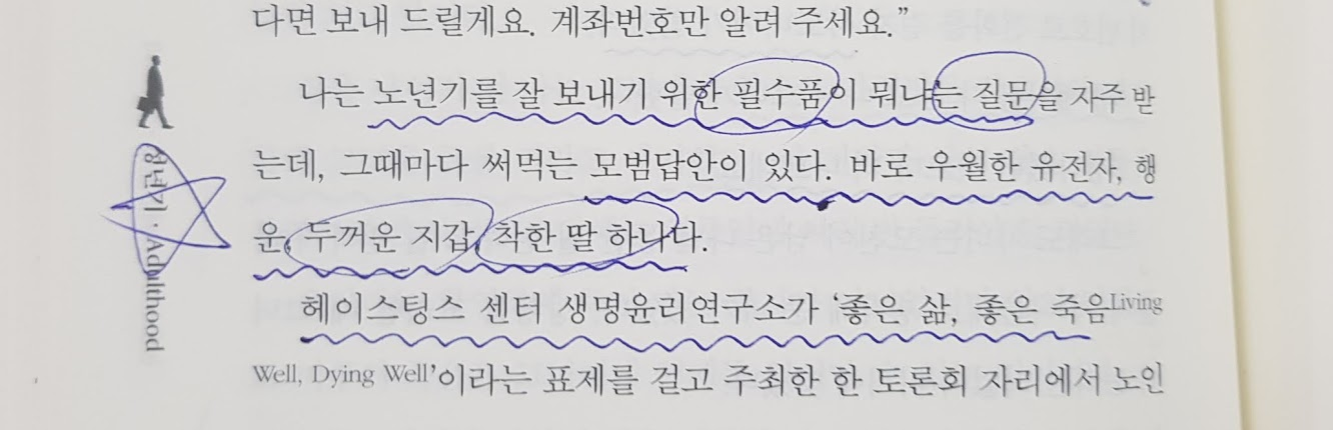 잠시 다른 책을 읽었다가 다시 이 책으로 돌아왔습니다. 읽을수록 나는 나중에 어떻게 될지 경각심이 듭니다. 학생은 유치원부터 대학생까지 세세하게 구분하지만, 그보다 훨씬 더 긴 노년기는 그냥 '노인'으로 퉁쳐버리는 것을 보면 알 수 있습니다. 태어날 때는 다 똑같지만 노인이 되면 다 저마다의 인생이 결실을 맺어 아름다운 시기라는 것을 기억해야 합니다.