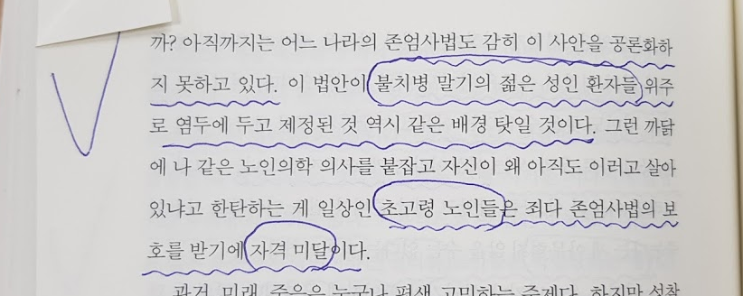 자유롭게 살아갈 권리가 있다면 마찬가지로 마음대로 죽을 권리도 있습니다. 이를 안락사 혹은 존엄사라고 합니다. 하지만 정작 현장에는 무시되기 일쑤입니다. 그 권리의 주체가 현실의 수많은 초고령 노인이 아닌 불치명 말기의 젊은 성인 환자인 탓입니다. 법에서도 노인은 무시받는 것이 지금의 현실입니다.