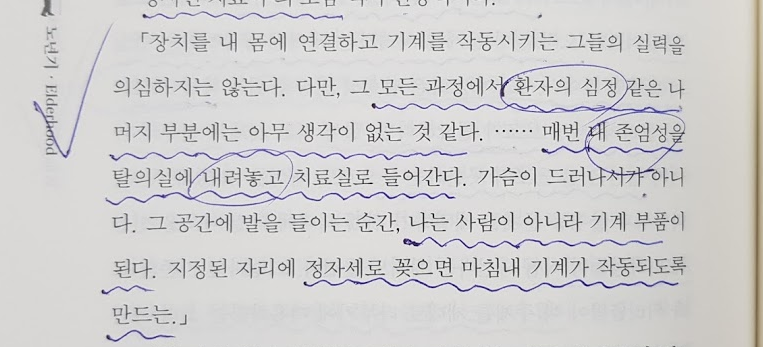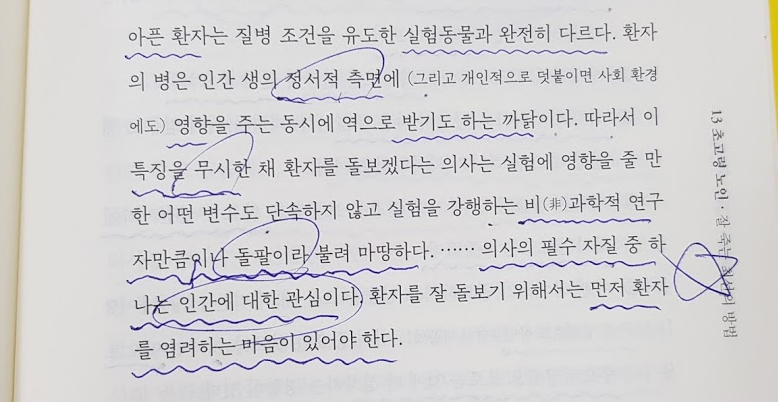 현대 의학과 의료의 문제점이 가장 잘 느껴지는 부분이 있습니다. 회사에서 직원을 HR(인간자원)이라 하듯, 환자는 마치 정자세로 꽂아야 작동하는 기계와 같다는 문장은 안쓰러우면서 두려움이 느껴집니다. 실력이 뛰어난 사람보다 자신의 존엄성을 이해해주는 사람이 더 좋은 의사가 아닐까 합니다.