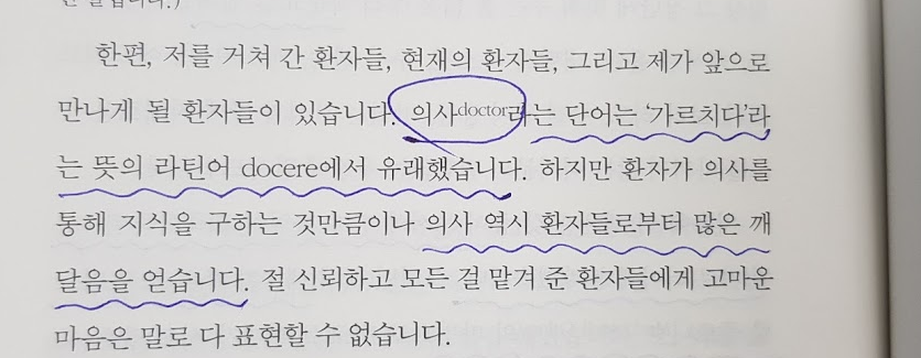 의사는 영어는 doctor입니다. 영어를 처음 배울 때 듣는 기초적인 단어죠. 이 단어의 어원은 라틴어로 '가르치다'라는 의미를 가지고 있습니다. 과거 일방적인 수술과 의료에서 앞으로는 아닌 쌍방의 소통과 공감이 중점이 되어 누구라도 서로한테 좋은 의사가 될 수 있는 사회가 되었으면 좋겠습니다.