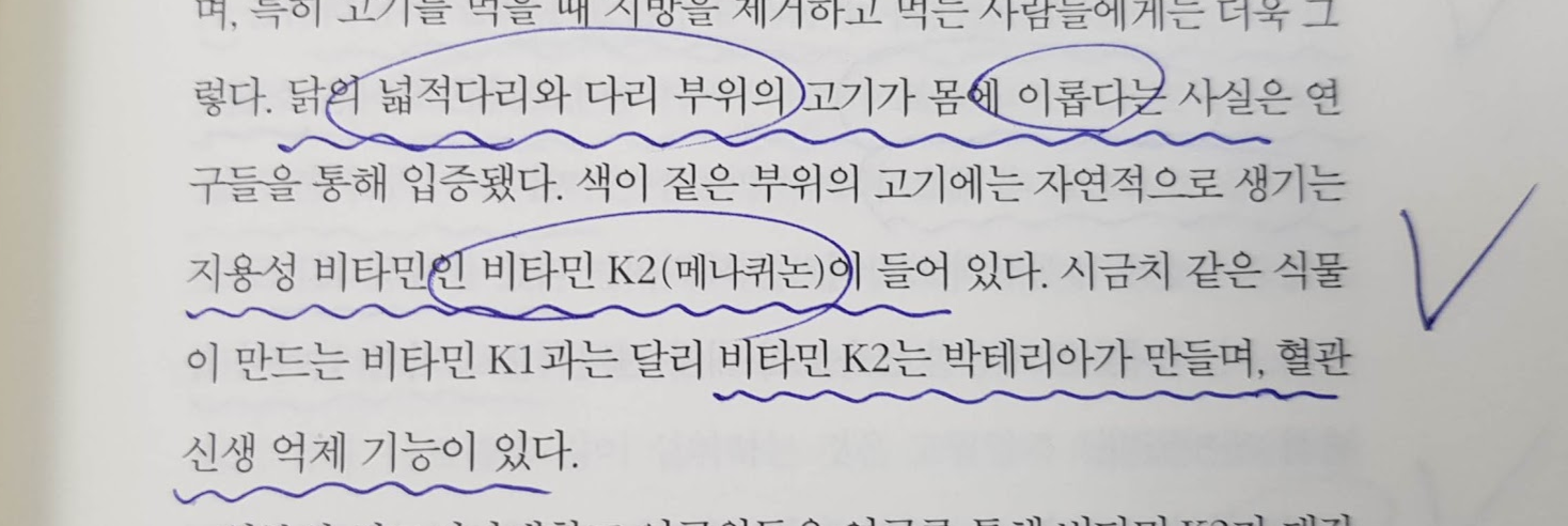 닭에서 가장 건강에 좋은 부위는 가슴살이라고 알고 있습니다. 하지만 이 박사님은 꼭 그렇지 않다고 합니다. 닭다리에는 비타민 K2가 많아서 혈관을 건강하게 만들어준다고 합니다. 전문용어로 '메나퀴논'이라고 하는데, 퍽퍽한 가슴살 대신 닭다리를 뜯을 이유가 생겨서 맘에 듭니다!