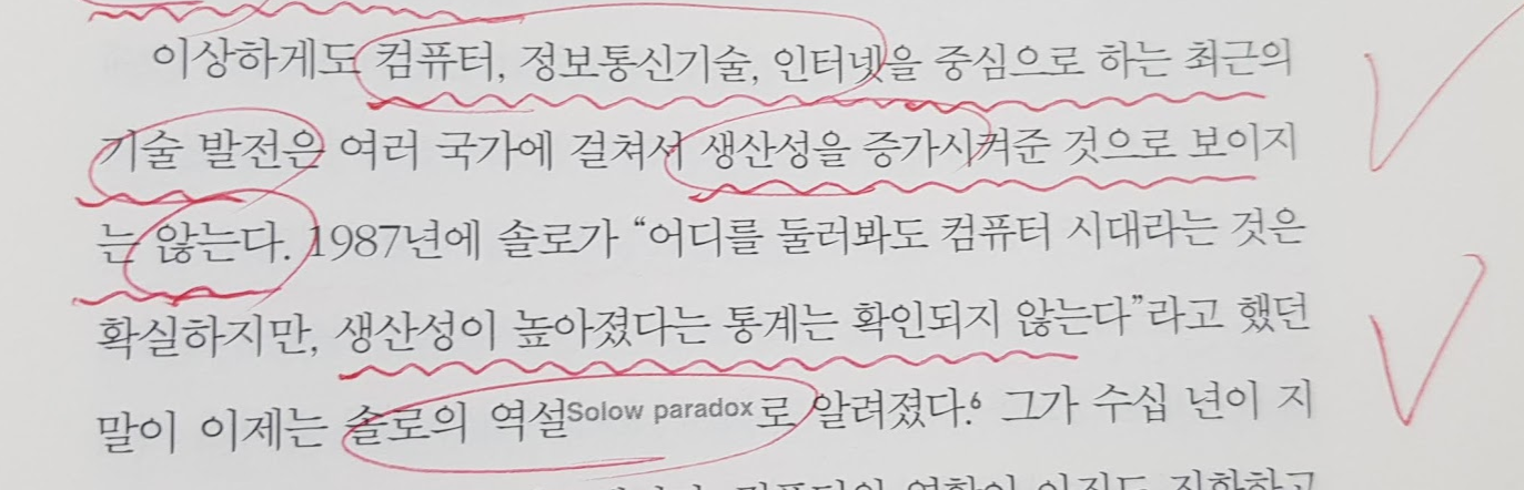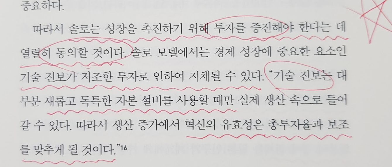 성장을 위해서는 당연 투자가 있어야 합니다. 밭에 콩을 심어야 콩을 수확하는 법이니까요. 하지만 과거에는 10개씩 나던 것이 요즘에는 2,3개 정도만 나는 게 문제입니다. 솔로는 이것이 기술의 문제로 보았습니다. 새롭고 독특한 설비가 필요하다고 하였는데 한마디로 혁신이 중요하다는 말씀입니다. 남들처럼 따라 하는 게 아닌 남들과 다른 나만의 능력을 키워야겠습니다.