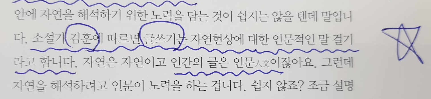 글쓰기는 인문학의 핵심입니다. 자연에 대해 사람으로서 하는 대화이기 때문입니다. 글쓰기는 초등학교에 마스터하는 기본 스킬이 아니라 평생 갈고닦아야 할 훌륭한 대화 수단임을 깨닫습니다.