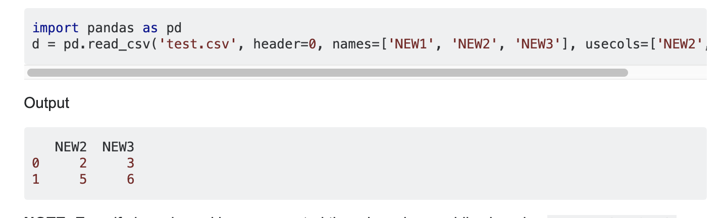 d = pd.read_csv('test.csv', header=0, names=['NEW1', 'NEW2', 'NEW3'], usecols=['NEW2', 'NEW3'])