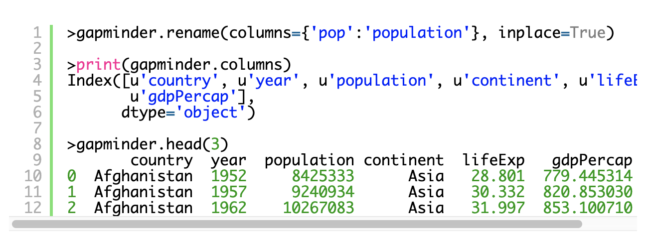 gapminder.rename(columns={'pop':'population'}, inplace=True)