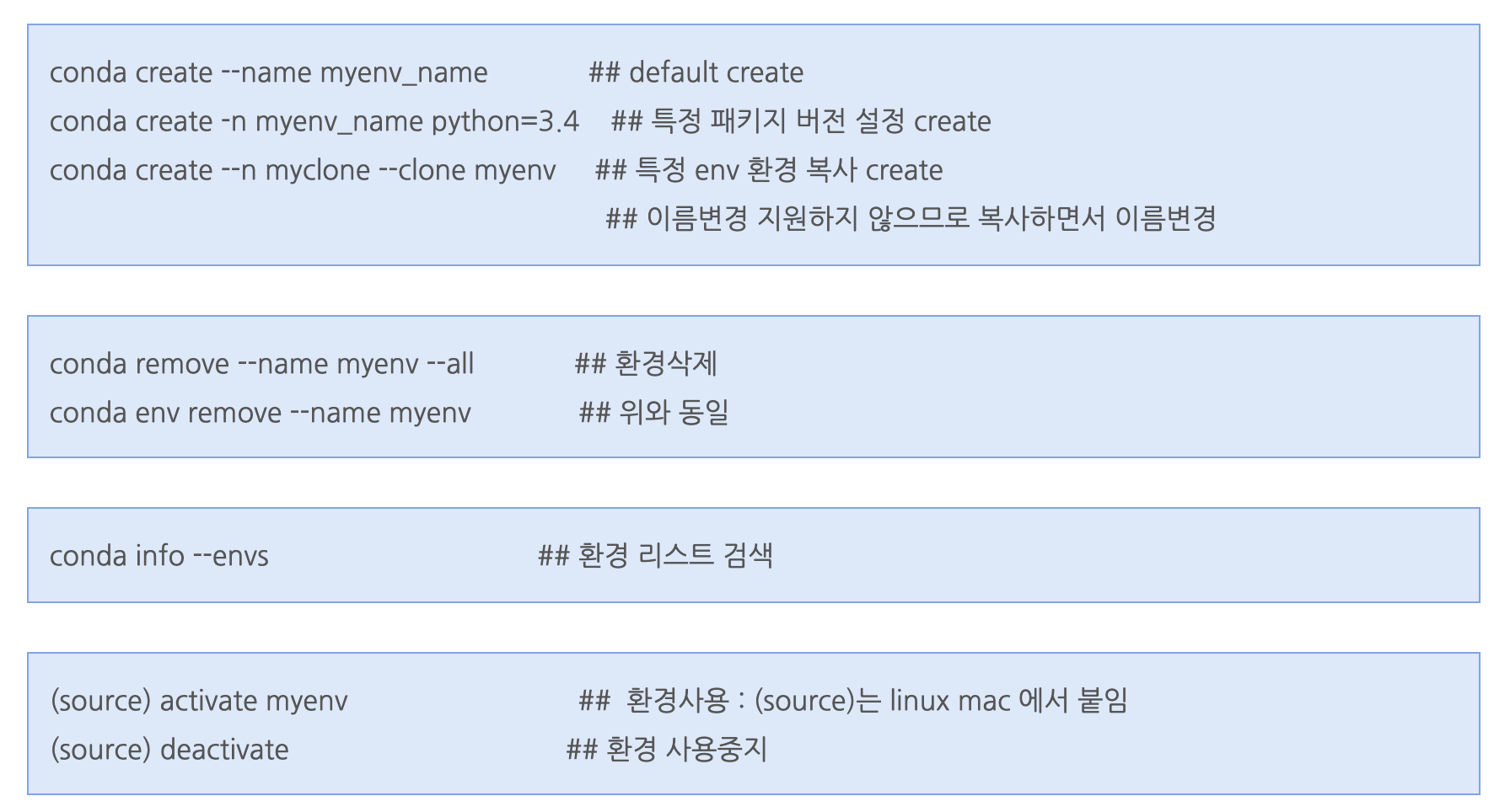 생성 : conda create --name myenv_name / 삭제 : conda remove / 검색 : conda info / 사용 : activate 이름 / 나감 : deactivate