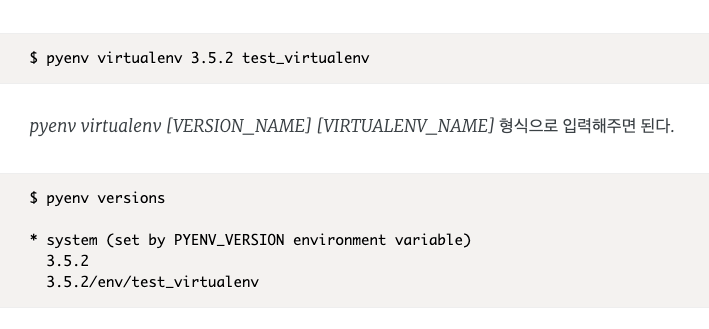 새로운 가상환경을 만드는 명령어. pyenv virtualenv [VERSION_NAME] [VIRTUALENV_NAME] 형식