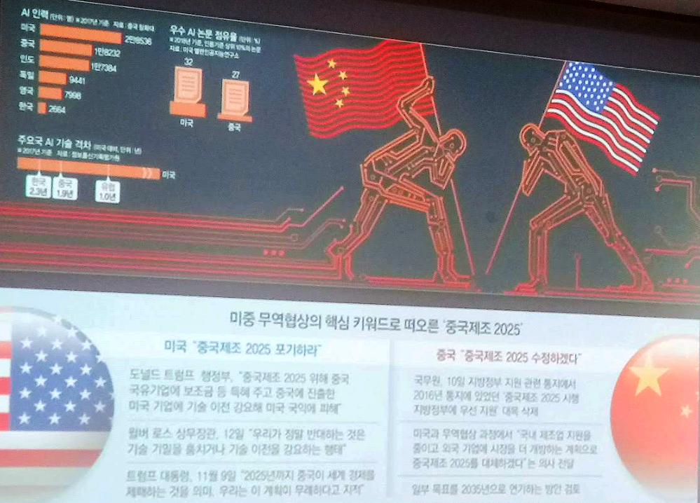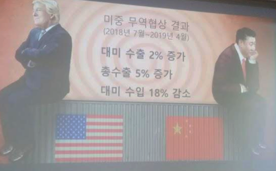 지금은 좀 잠잠해졌지만 미국과 중국이 주요 수출항목에 관세를 부가하면서 무역전쟁이 발발하였다. 강사는 이 무역전쟁을 두고 무조건 중국이 이길 것이라고 말하였다.