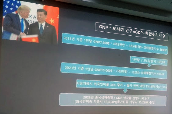 그런데 2019년 현재 상해종합지수는 3000포인트 수준이다. 예상에 약 3배 정도나 싼 편이다. 그래서 중국에 투자하려면 지금이 적기라고 할 수 있다. 강사는 참고로 중국 기업은 전부 다 국영이라고 설명하였다. 즉 손해가 나면 국가가 담당한다는 것이다. 이런 내용도 모르고 중국 기업이 부도날 것을 걱정하는 것은 무식한 것이라며 정확히 알 필요가 있다고 하였다.