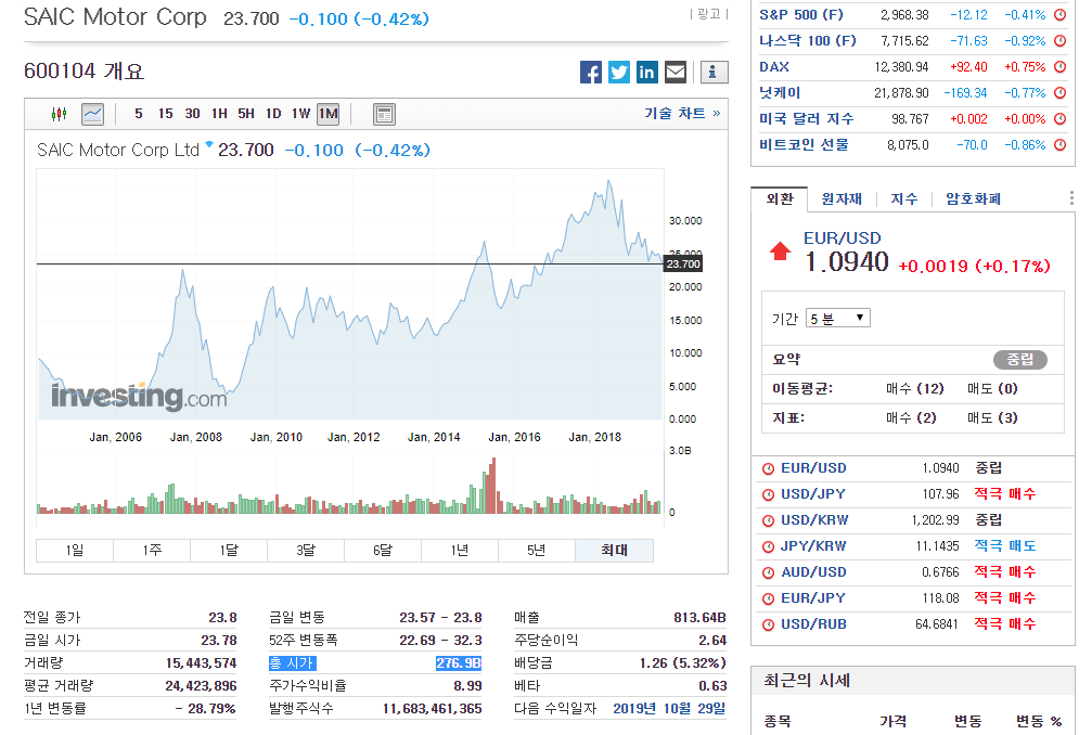 우리나라에서 차량 등록한 자동차는 약 2천만 대 정도이다. 그런데 중국의 경우 작년 한 해 동안 판매된 자동차 수가 그 정도이다. 스케일이 다른 나라다. 중국의 대표적인 자동차 업체로 상하이 자동차가 있는데 시가 총액이 276.9B이다. 276조 위안이며 원화로 계산하면 46조 6천억 원이라는 놀라운 수치를 보여준다. 비교할 수 있는 게 현대차, 현대모비스가 있는데 각각 26조, 23조로 둘을 합쳐야 비슷해지는 수준이다.