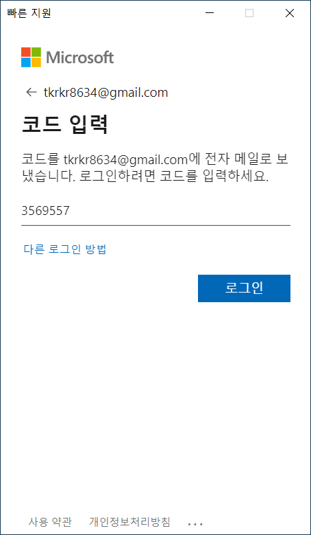 상대방을 지원할 경우 '다른 사람 지원'을 누르고 윈도우 계정으로 로그인해줍니다.