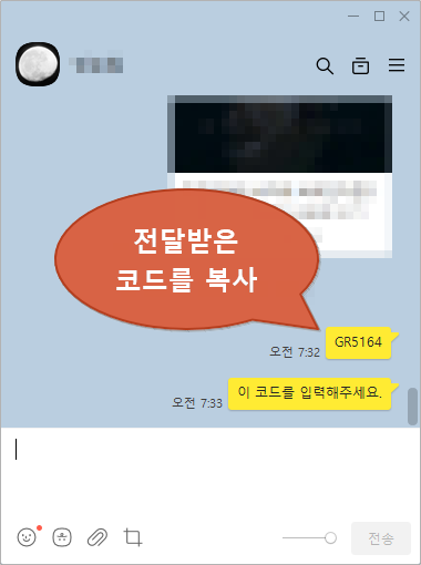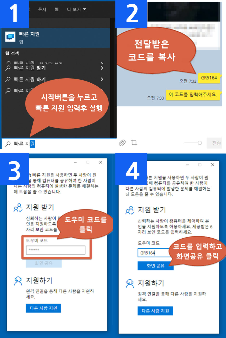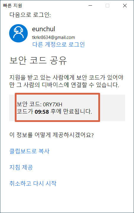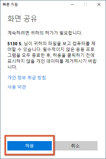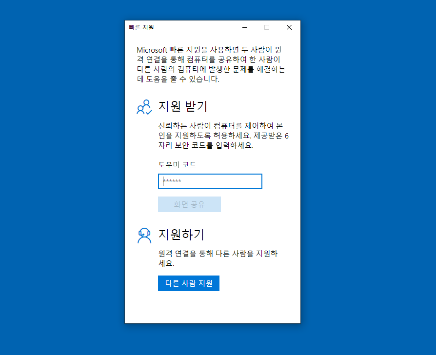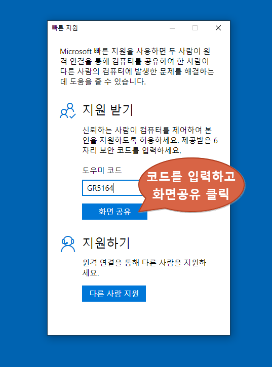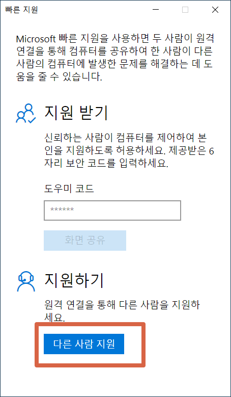지원을 해줄 사람한테서 6자리 코드를 전달받으면 원격지원이 가능합니다.