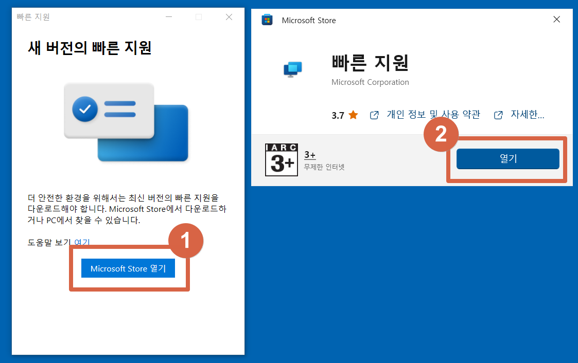 '새 버전의 빠른 지원'이 나오면 Store 열기를 눌러서 설치해줍니다. 설치를 완료하면 '열기' 버튼이 활성화 됩니다.
