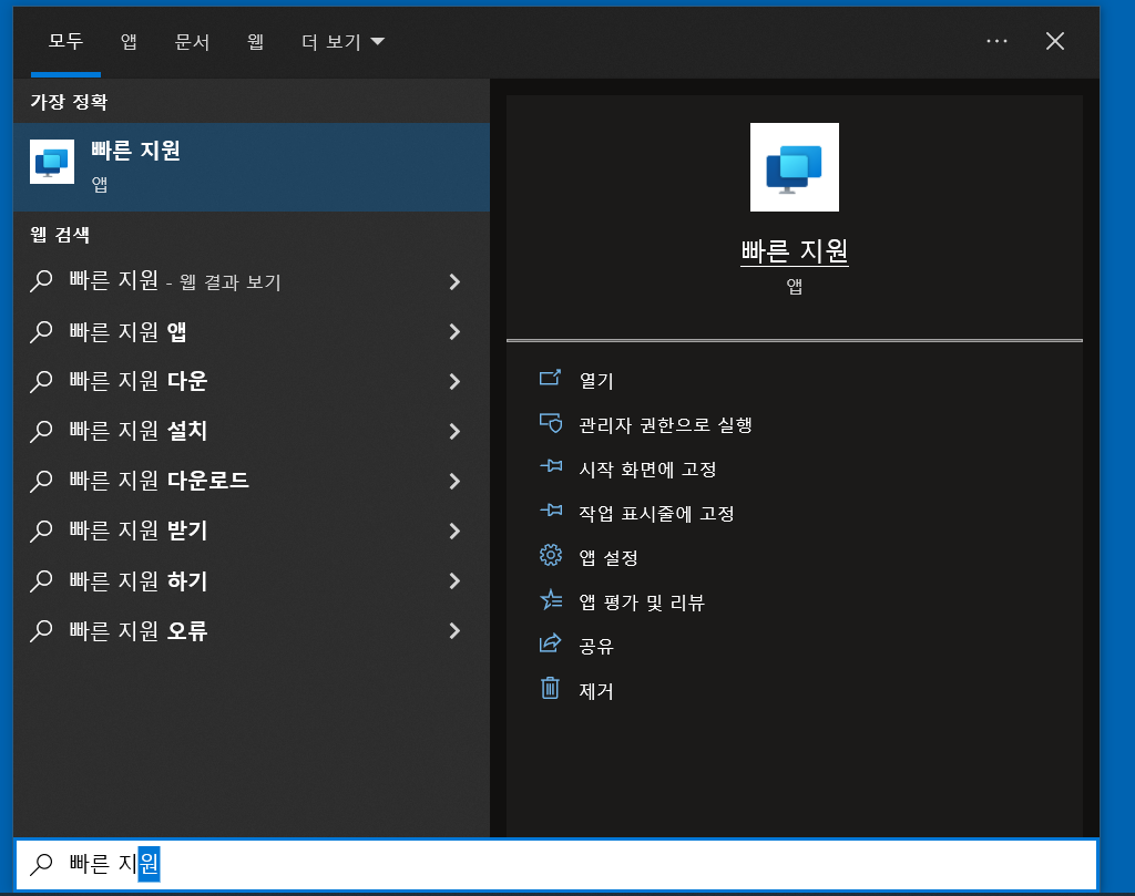 시작 버튼을 누르고 '빠른 지원'을 입력하면 바로 나옵니다.