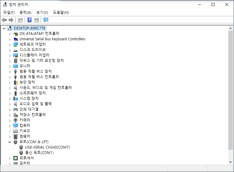 장치관리자가 열리면 하단 포트에서 USB-SERIAL CH340의 포트 번호를 확인합니다.
