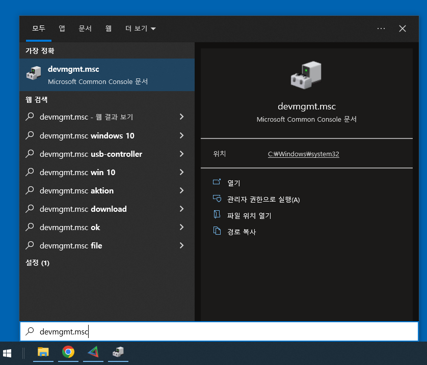 그리고 devmgmt.msc 을 입력하면 장치관리자가 실행됩니다.