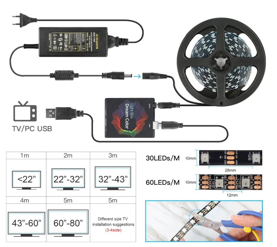 13761.0₩ 44% OFF|5V WS2812B USB LED 스트립 빛 5050 RGB 드림 컬러 주변 TV 키트 데스크탑 PC 화면, 배경 조