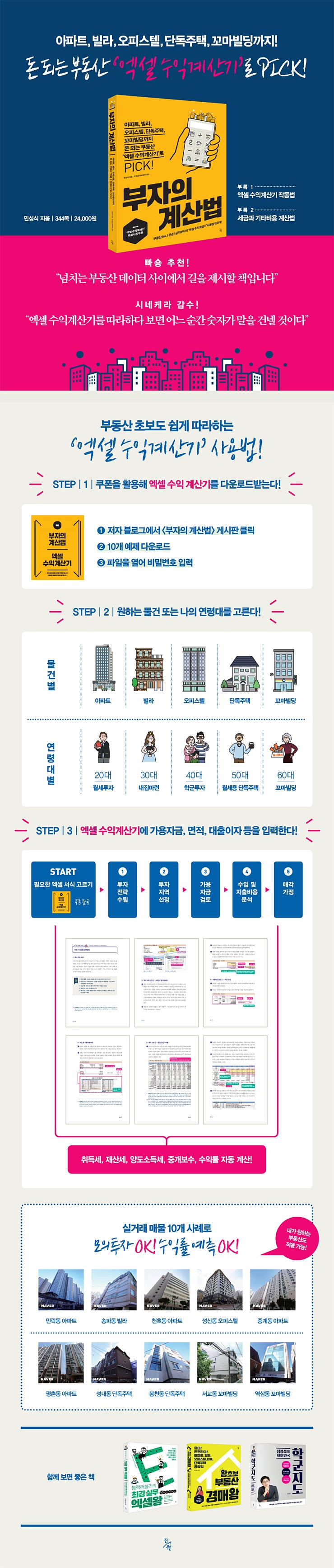 <부자의 계산법>은 부동산을 사기 전 ‘엑셀 수익계산기’로 모의투자를 해보는 책이다. 입지분석부터 시작하여 매입금액, 세금, 대출이자 등을 입력하면 매도 시 수익률을 자동 계산해 준다. 엑셀에 수치를 입력할 때마다 세심한 설명이 수록되어 마치 일타강사에게 과외를 받는 것 같은 경험을 하게 된다.